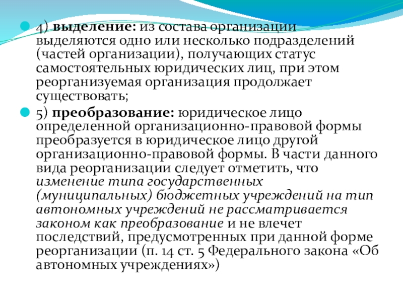 5) преобразование: юридическое лицо определенной организационно-правовой формы преобразуется в юридическое лицо другой организационно-правовой формы. В части данного вида реорганизации следует отметить, что изменение типа государственных (муниципальных) бюджетных учреждений на тип автономных учреждений не рассматривается законом как преобразование и не влечет последствий, предусмотренных при данной форме реорганизации (п. 14 ст. 5 Федерального закона «Об автономных учреждениях»)