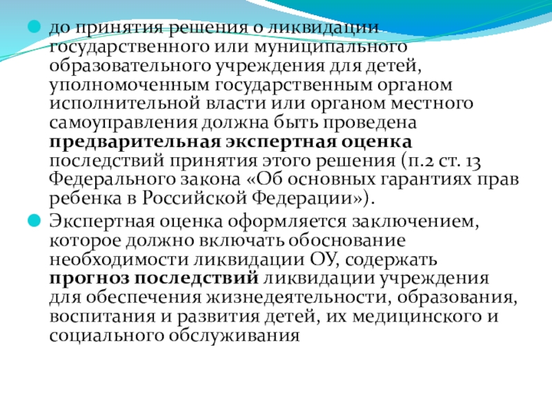 Экспертная оценка оформляется заключением, которое должно включать обоснование необходимости ликвидации ОУ, содержать прогноз последствий ликвидации учреждения для обеспечения жизнедеятельности, образования, воспитания и развития детей, их медицинского и социального обслуживания