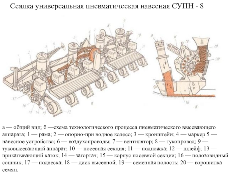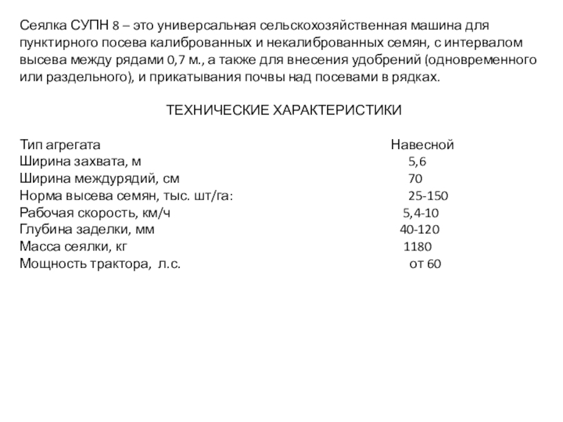 Слайд 25Сеялка СУПН 8 – это универсальная сельскохозяйственная машина для пунктирного посева