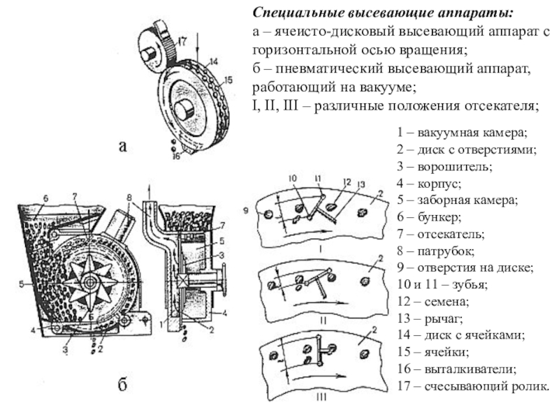 б – пневматический высевающий аппарат, работающий на вакууме;