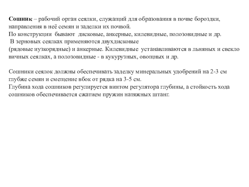 Сошник – рабочий орган сеялки, служащий для образования в почве бороздки,