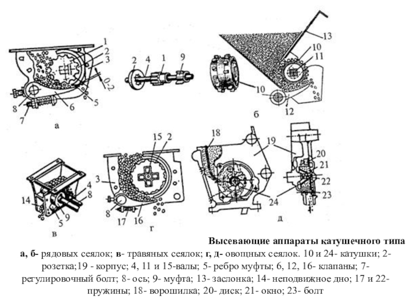 а, б- рядовых сеялок; в- травяных сеялок; г, д- овощных сеялок. 10 и 24- катушки; 2- розетка;19 - корпус; 4, 11 и 15-валы; 5- ребро муфты; 6, 12, 16- клапаны; 7- регулировочный болт; 8- ось; 9- муфта; 13- заслонка; 14- неподвижное дно; 17 и 22- пружины; 18- ворошилка; 20- диск; 21- окно; 23- болт