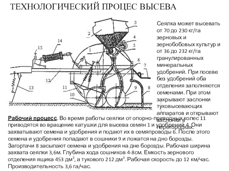 Рабочий процесс. Во время работы сеялки от опорно-приводных колес 11 приводятся во вращение катушки для высева семян 1 и удобрений 4. Они захватывают семена и удобрения и подают их в семяпроводы 6. После этого семена и удобрения попадают в сошники 9 и ложатся на дно борозды. Загортачи 8 засыпают семена и удобрения на дне борозды. Рабочая ширина захвата сеялки 3,6м. Глубина хода сошников 4-8см. Емкость зернового отделения ящика 453 дм3, а тукового 212 дм3. Рабочая скорость до 12 км/час. Производительность 3,6 га/час.