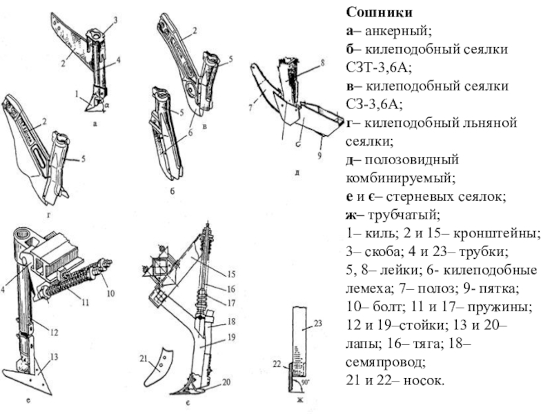 В зерновых сеялках применяются двухдисковые (рядовые иузкорядные) и анкерные. Килевидные устанавливаются в льняных и свекловичных сеялках, а полозовидные - в кукурузных, овощных и др.