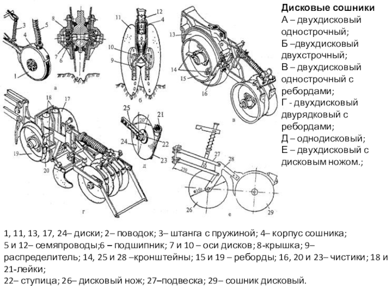 22– ступица; 26– дисковый нож; 27–подвеска; 29– сошник дисковый.