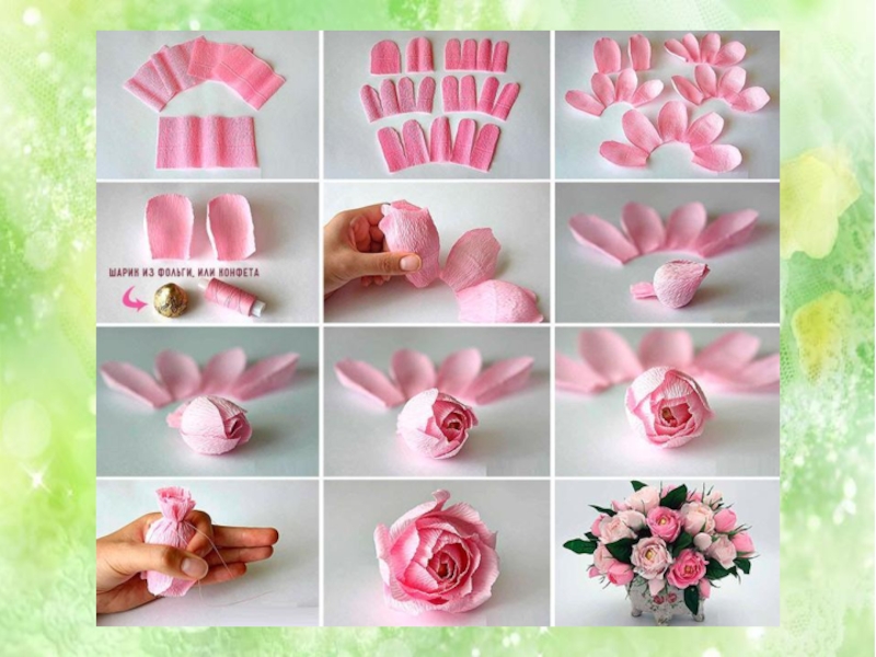 Слайд 1Пошаговые фото изготовления цветка из гофрированной бумаги.