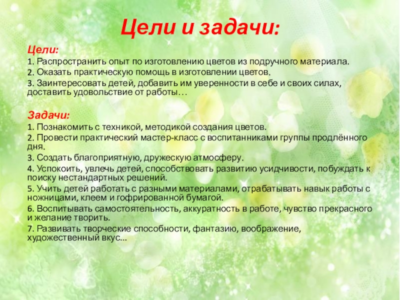 1. Распространить опыт по изготовлению цветов из подручного материала.