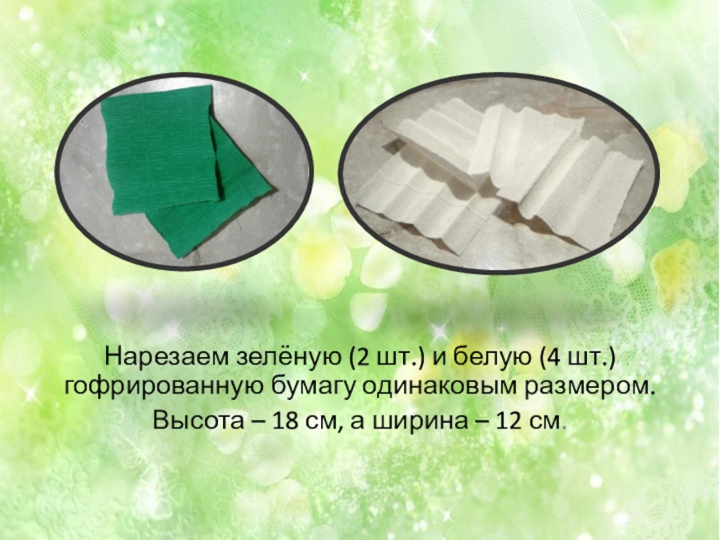 Нарезаем зелёную (2 шт.) и белую (4 шт.) гофрированную бумагу одинаковым