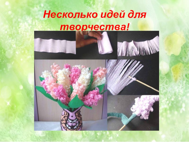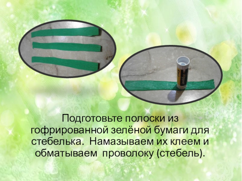 Слайд 14Подготовьте полоски из гофрированной зелёной бумаги для стебелька. Намазываем их клеем
