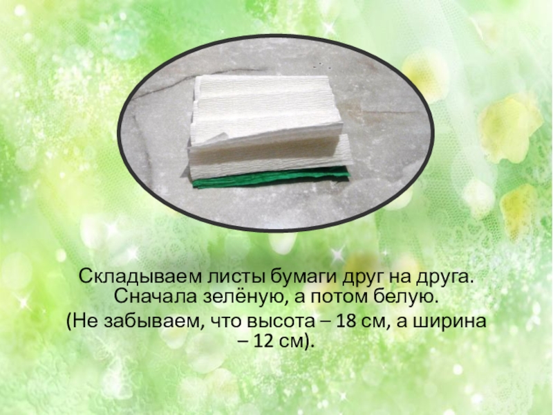 Слайд 10Складываем листы бумаги друг на друга. Сначала зелёную, а потом белую.
