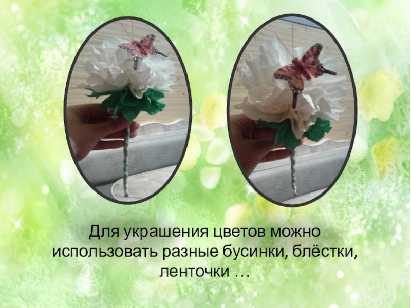 Слайд 22Для украшения цветов можно использовать разные бусинки, блёстки, ленточки …