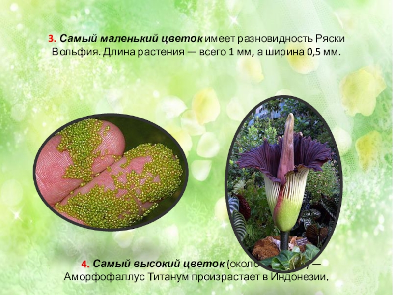 Слайд 63. Самый маленький цветок имеет разновидность Ряски Вольфия. Длина растения —
