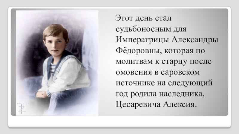 молитвам к старцу после омовения в саровском источнике на следующий год родила наследника, Цесаревича Алексия.