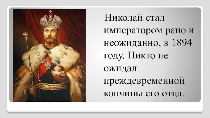 Слайд 6 Николай стал императором рано и неожиданно, в 1894 году. Никто