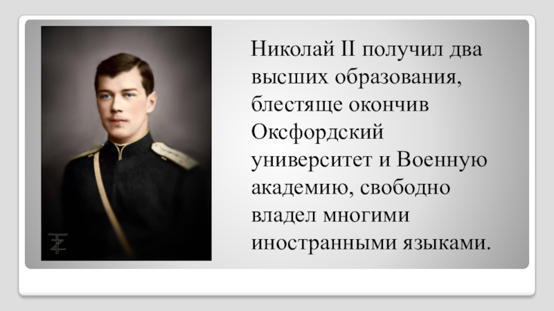 Николай II получил два высших образования, блестяще окончив Оксфордский университет и Военную академию, свободно владел многими