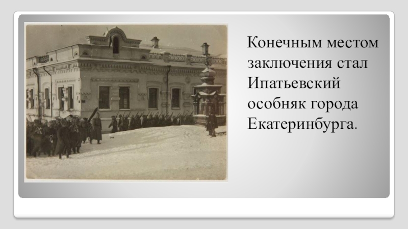 Слайд 13 Конечным местом заключения стал Ипатьевский особняк города Екатеринбурга.