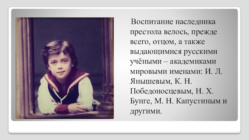 Воспитание наследника престола велось, прежде всего, отцом, а также выдающимися русскими учёными – академиками мировыми