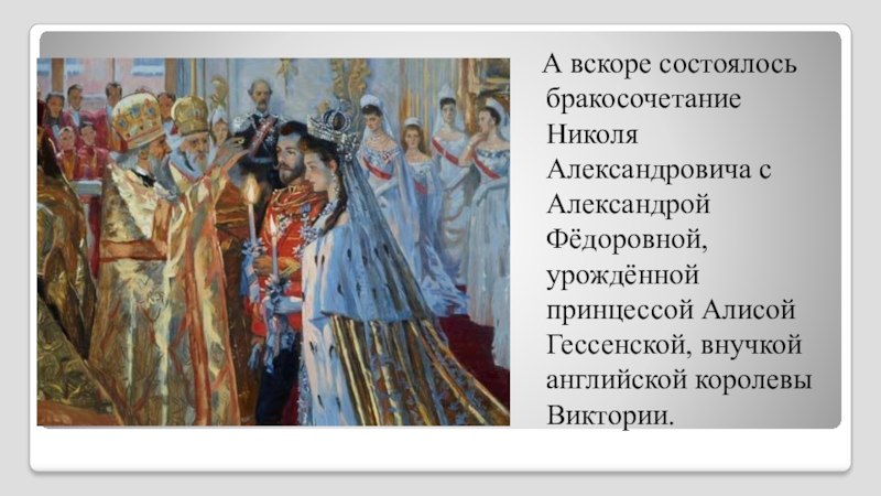 Слайд 7 А вскоре состоялось бракосочетание Николя Александровича с Александрой Фёдоровной, урождённой