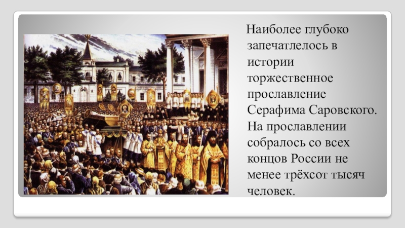 Слайд 9 Наиболее глубоко запечатлелось в истории торжественное прославление Серафима Саровского. На