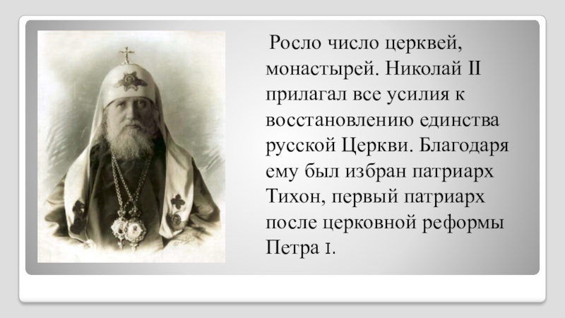 Слайд 8 Росло число церквей, монастырей. Николай II прилагал все усилия