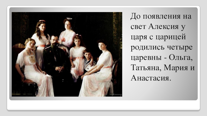 До появления на свет Алексия у царя с царицей родились четыре царевны - Ольга, Татьяна, Мария