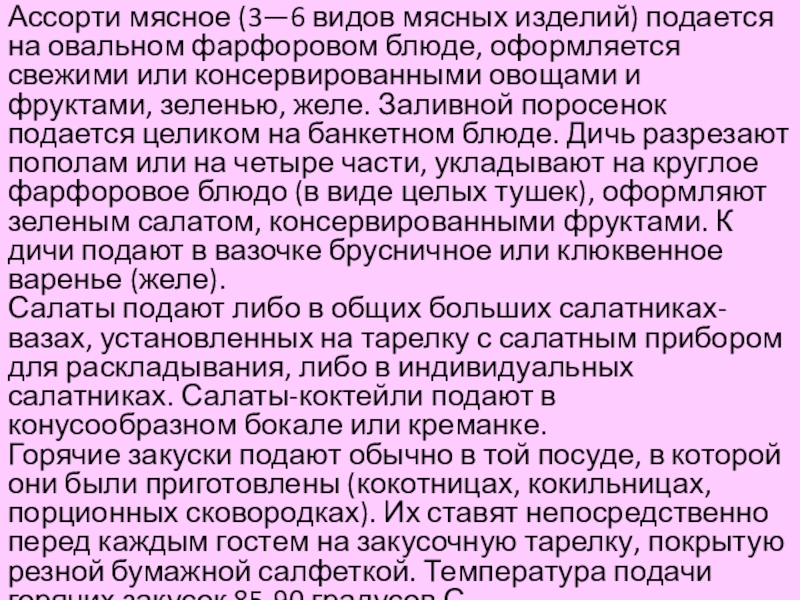 Слайд 7Ассорти мясное (3—6 видов мясных изделий) подается на овальном фарфоровом блюде,