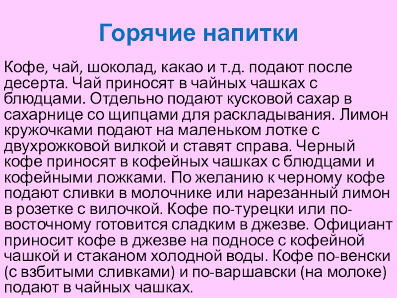 приносят в чайных чашках с блюдцами. Отдельно подают кусковой сахар в сахарнице со щипцами для раскладывания. Лимон кружочками подают на маленьком лотке с двухрожковой вилкой и ставят справа. Черный кофе приносят в кофейных чашках с блюдцами и кофейными ложками. По желанию к черному кофе подают сливки в молочнике или нарезанный лимон в розетке с вилочкой. Кофе по-турецки или по-восточному готовится сладким в джезве. Официант приносит кофе в джезве на подносе с кофейной чашкой и стаканом холодной воды. Кофе по-венски (с взбитыми сливками) и по-варшавски (на молоке) подают в чайных чашках.