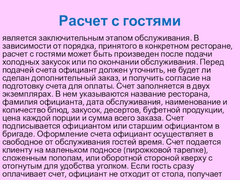 в конкретном ресторане, расчет с гостями может быть произведен после подачи холодных закусок или по окончании обслуживания. Перед подачей счета официант должен уточнить, не будет ли сделан дополнительный заказ, и получить согласие на подготовку счета для оплаты. Счет заполняется в двух экземплярах. В нем указываются название ресторана, фамилия официанта, дата обслуживания, наименование и количество блюд, закусок, десертов, буфетной продукции, цена каждой порции и сумма всего заказа. Счет подписывается официантом или старшим официантом в бригаде. Оформление счета официант осуществляет в свободное от обслуживания гостей время. Счет подается клиенту на маленьком подносе (пирожковой тарелке), сложенным пополам, или оборотной стороной кверху с отогнутым для удобства уголком. Если гость сразу оплачивает счет, официант не отходит от стола, получает деньги и вручает сдачу.