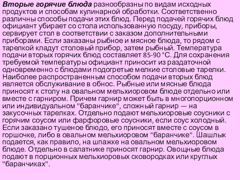 обработки. Соответственно различны способы подачи этих блюд. Перед подачей горячих блюд официант убирает со стола использованную посуду, приборы, сервирует стол в соответствии с заказом дополнительными приборами. Если заказаны рыбное и мясное блюда, то рядом с тарелкой кладут столовый прибор, затем рыбный. Температура подачи вторых горячих блюд составляет 85-90 °С. Для сохранения требуемой температуры официант приносит из раздаточной одновременно с блюдами подогретые мелкие столовые тарелки. Наиболее распространенным способом подачи вторых блюд является обслуживание в обнос. Рыбные или мясные блюда приносят к столу на овальном мельхиоровом блюде отдельно или вместе с гарниром. Причем гарнир может быть в многопорционном или индивидуальном "баранчике", сложный гарнир — на закусочных тарелках. Отдельно подают мельхиоровые соусники с горячим соусом или фарфоровые соусники, если соус холодный. Если заказано тушеное блюдо, его приносят вместе с соусом в горшочке, либо в овальном мельхиоровом "баранчике". Шашлык подается, как правило, на шпажке на овальном мельхиоровом блюде. Отдельно в салатнике приносят гарнир. Овощные блюда подают в порционных мельхиоровых сковородках или круглых "баранчиках".