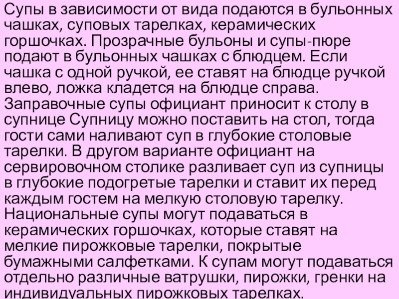 керамических горшочках. Прозрачные бульоны и супы-пюре подают в бульонных чашках с блюдцем. Если чашка с одной ручкой, ее ставят на блюдце ручкой влево, ложка кладется на блюдце справа. Заправочные супы официант приносит к столу в супнице Супницу можно поставить на стол, тогда гости сами наливают суп в глубокие столовые тарелки. В другом варианте официант на сервировочном столике разливает суп из супницы в глубокие подогретые тарелки и ставит их перед каждым гостем на мелкую столовую тарелку. Национальные супы могут подаваться в керамических горшочках, которые ставят на мелкие пирожковые тарелки, покрытые бумажными салфетками. К супам могут подаваться отдельно различные ватрушки, пирожки, гренки на индивидуальных пирожковых тарелках.