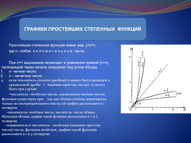 При n=1 выражение переходит в уравнение прямой (y=x), проходящей через начало координат под углом 45град.
