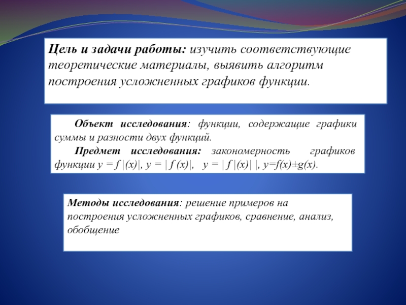 Предмет исследования: закономерность графиков функции у = f |(х)|, у = | f (х)|, у = | f |(х)| |, y=f(x)±g(x).