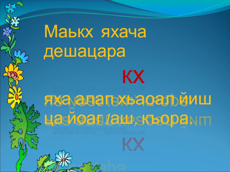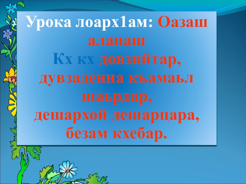 Урока лоарх1ам: Оазаш алапаш Кх кх довзийтар, дувзаденна къамаьл шаьрдар, дешархой дешарцара, безам кхебар.