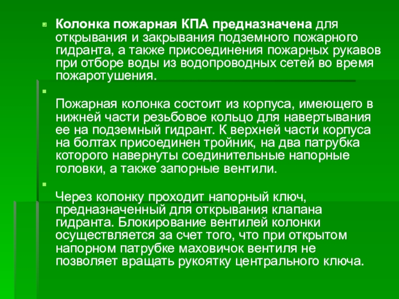 Слайд 15Колонка пожарная КПА предназначена для открывания и закрывания подземного пожарного гидранта,