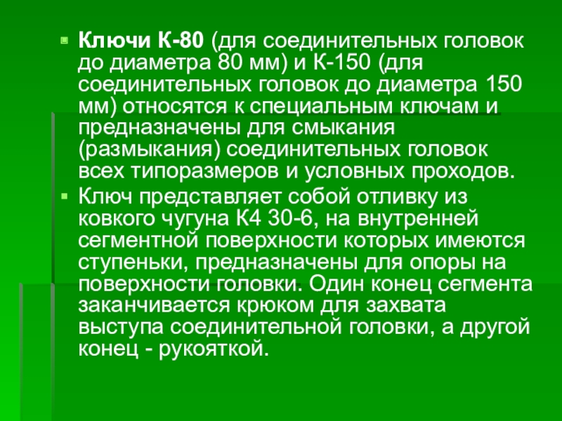 Слайд 20Ключи К-80 (для соединительных головок до диаметра 80 мм) и К-150
