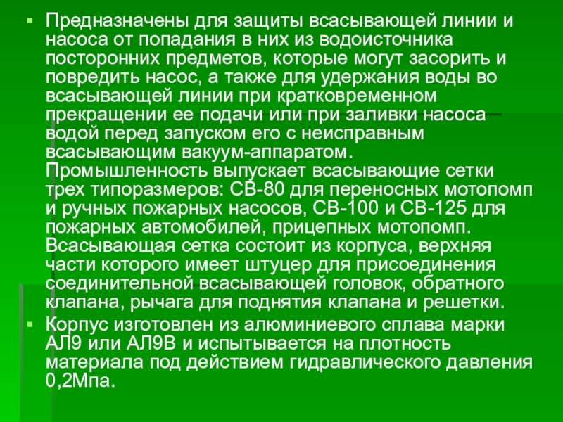 Слайд 3Предназначены для защиты всасывающей линии и насоса от попадания в них