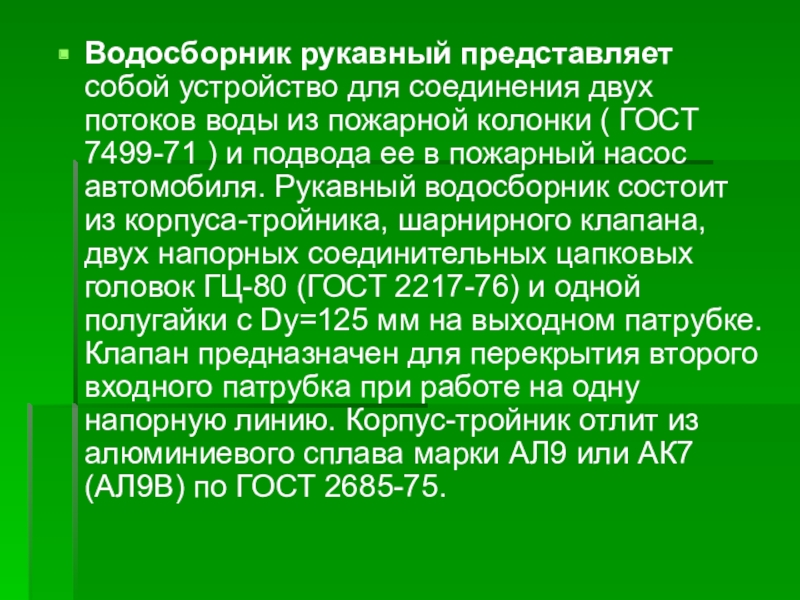 пожарной колонки ( ГОСТ 7499-71 ) и подвода ее в пожарный насос автомобиля. Рукавный водосборник состоит из корпуса-тройника, шарнирного клапана, двух напорных соединительных цапковых головок ГЦ-80 (ГОСТ 2217-76) и одной полугайки с Dу=125 мм на выходном патрубке. Клапан предназначен для перекрытия второго входного патрубка при работе на одну напорную линию. Корпус-тройник отлит из алюминиевого сплава марки АЛ9 или АК7 (АЛ9В) по ГОСТ 2685-75.