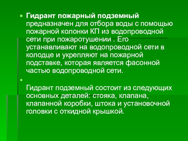 Слайд 17Гидрант пожарный подземный предназначен для отбора воды с помощью пожарной колонки
