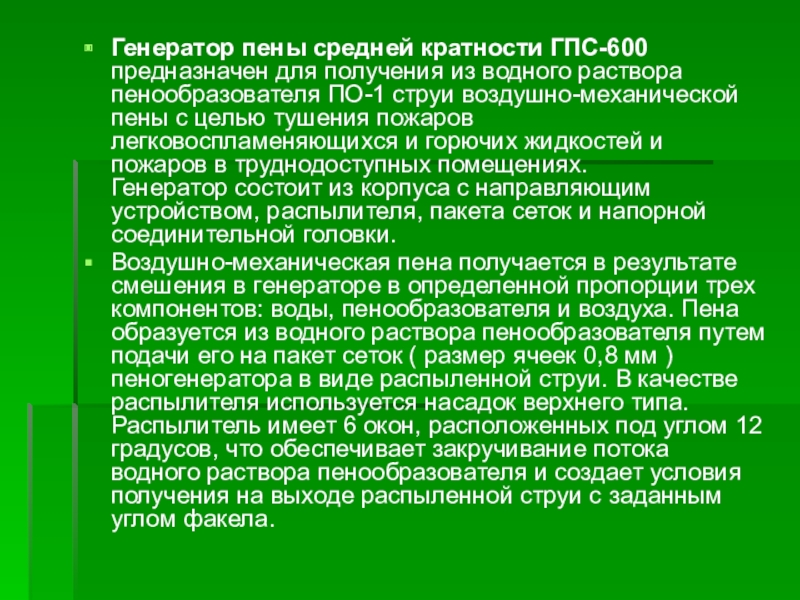 Слайд 12Генератор пены средней кратности ГПС-600 предназначен для получения из водного раствора