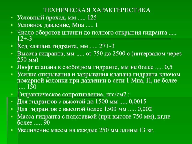 Масса гидранта с подставкой (при высоте 750 мм), кг,не более ..... 90