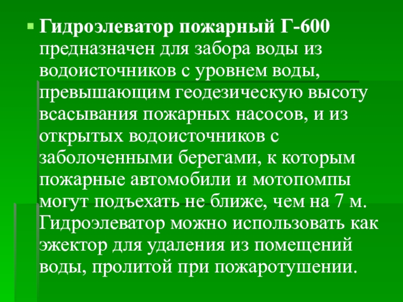Слайд 7Гидроэлеватор пожарный Г-600 предназначен для забора воды из водоисточников с уровнем