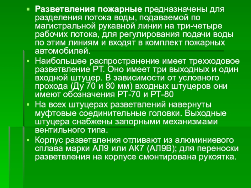 Слайд 10Разветвления пожарные предназначены для разделения потока воды, подаваемой по магистральной рукавной