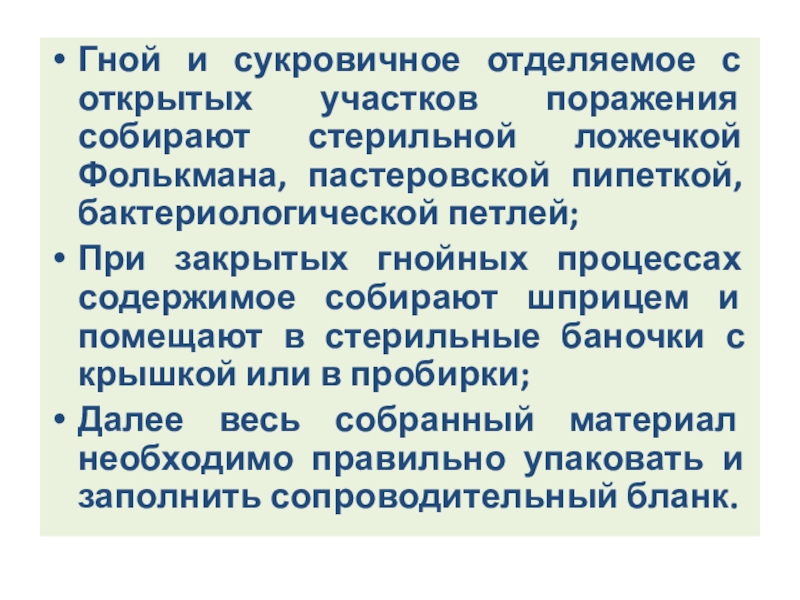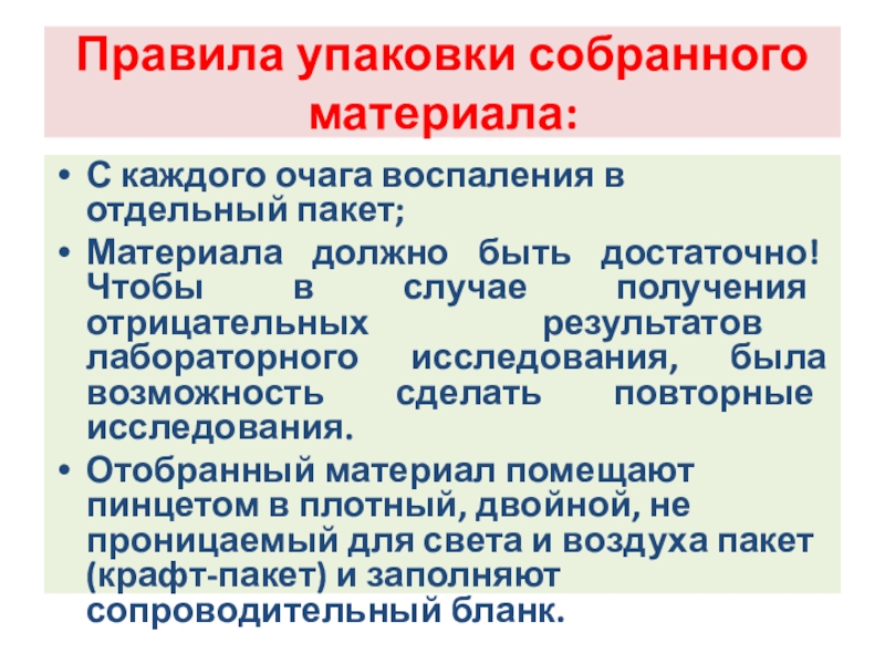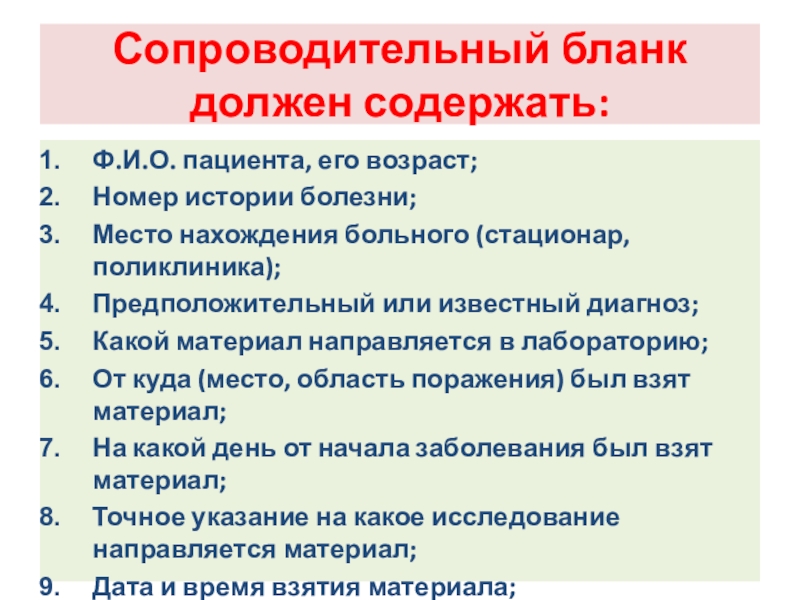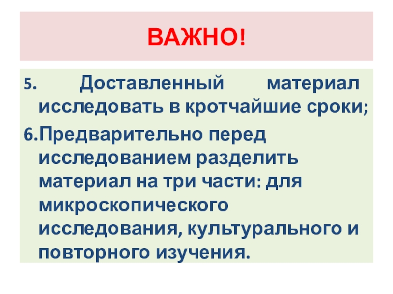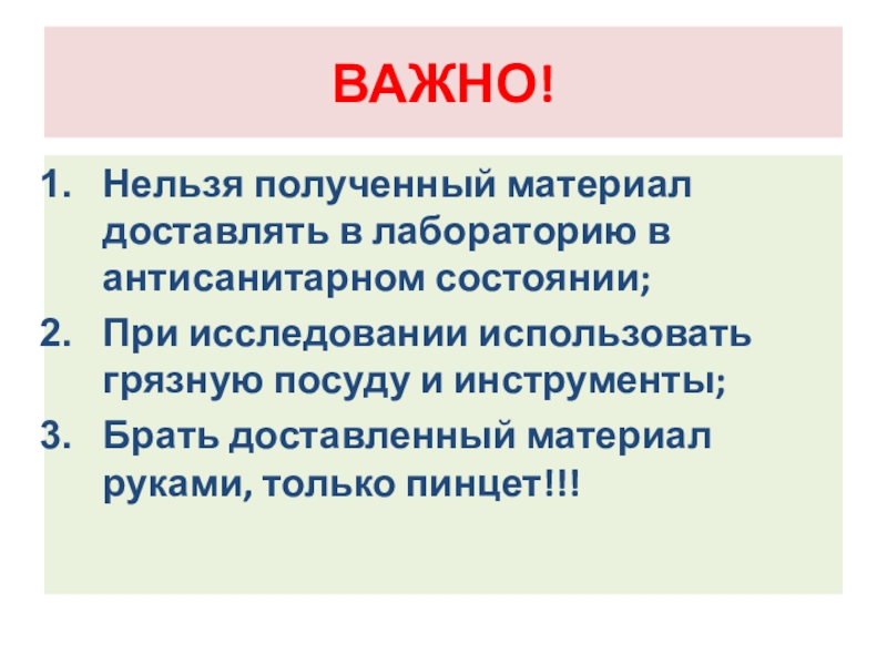 Слайд 111Взятый для исследования материал сортируют с учетом предполагаемого диагноза;