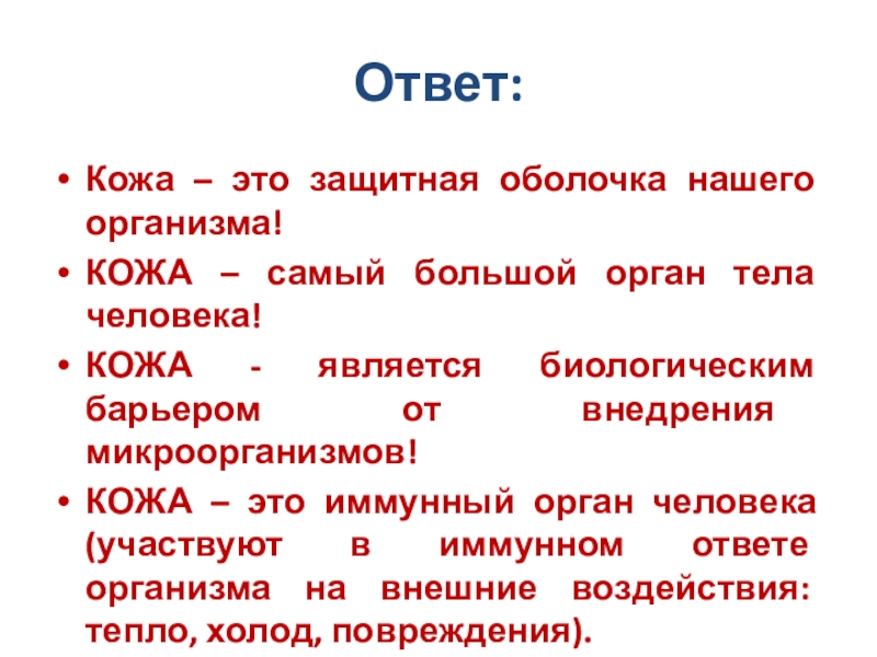 КОЖА – это иммунный орган человека (участвуют в иммунном ответе организма на внешние воздействия: тепло, холод, повреждения).