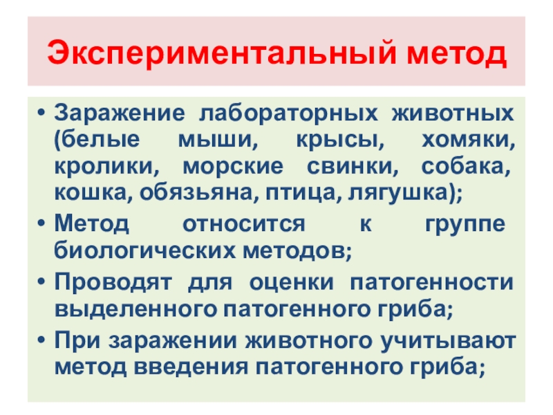При заражении животного учитывают метод введения патогенного гриба;