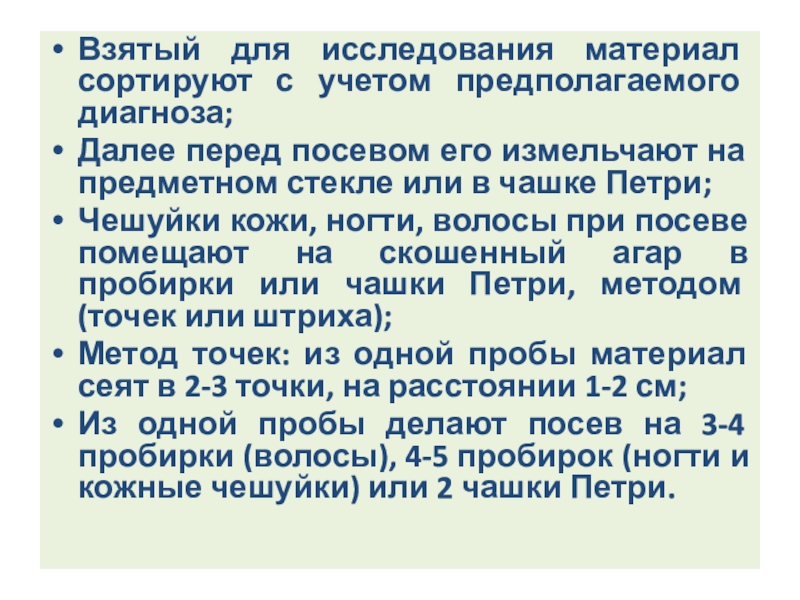 Чешуйки кожи, ногти, волосы при посеве помещают на скошенный агар в пробирки или чашки Петри, методом (точек или штриха);