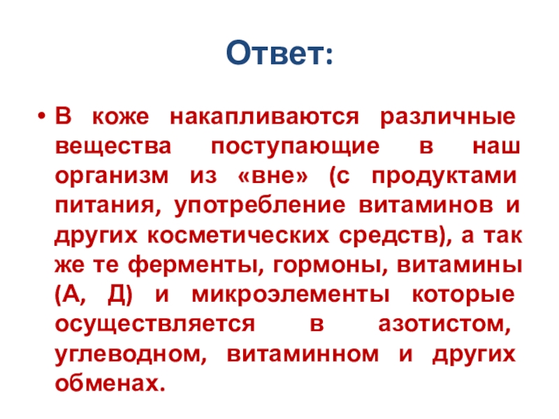 «вне» (с продуктами питания, употребление витаминов и других косметических средств), а так же те ферменты, гормоны, витамины (А, Д) и микроэлементы которые осуществляется в азотистом, углеводном, витаминном и других обменах.
