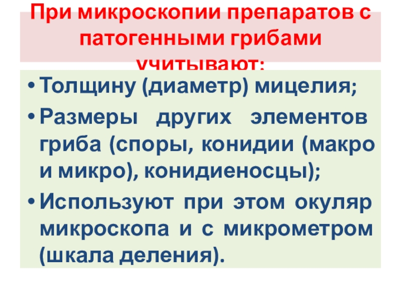 Слайд 108При микроскопии препаратов с патогенными грибами учитывают: