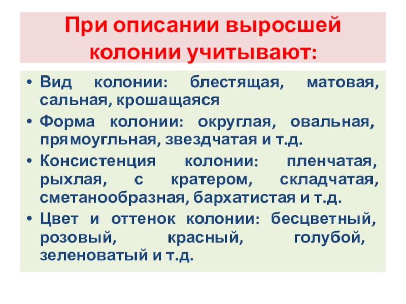 Слайд 112При описании выросшей колонии учитывают: