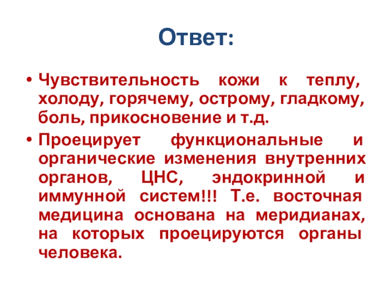 Проецирует функциональные и органические изменения внутренних органов, ЦНС, эндокринной и иммунной систем!!! Т.е. восточная медицина основана на меридианах, на которых проецируются органы человека.